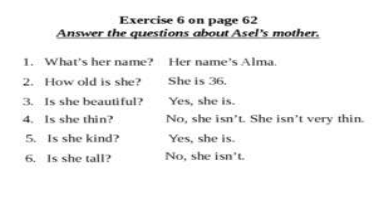 Exercise 6 on page 62 Answer the questions about Asel’s mother. Is she tall? No, she isn’t. Her name’s Alma. She is 36. Yes, she is. No, she isn’t. She isn’t very thin. Yes, she is. What’s her name? How old is she? Is she beautiful? Is she thin? Is she kind?