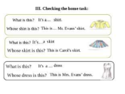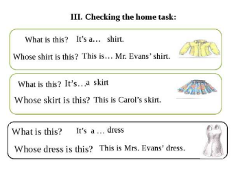 III. Checking the home task: It’s… Whose skirt is this? What is this? Whose dress is this? What is this? It’s a… shirt. This is… Whose shirt is this? Mr. Evans’ shirt. What is this? a skirt This is Carol’s skirt. It’s a … dress This is Mrs. Evans’ dress.