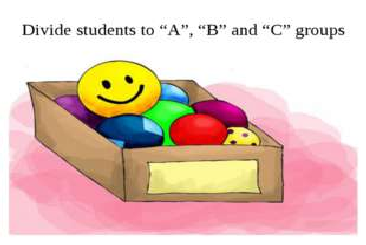Right you are! And now boys and girls, please come to the blackboard and take letters in the box. (Қорапішінде “A,B,C” әріптерібарсоләріптердіалуынабайланыстыоқушылар 3 топқабөлінеді).