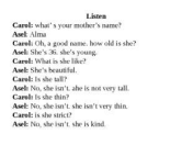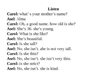 Listen Carol: what’ s your mother’s name? Asel: Alma Carol: Oh, a good name. how old is she? Asel: She’s 36. she’s young. Carol: What is she like? Asel: She’s beautiful. Carol: Is she tall? Asel: No, she isn’t. ahe is not very tall. Carol: Is she thin? Asel: No, she isn’t. she isn’t very thin. Carol: is she strict? Asel: No, she isn’t. she is kind.