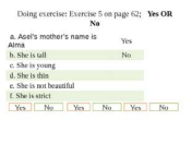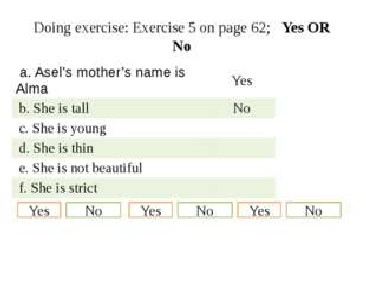 Doing exercise: Exercise 5 on page 62; Yes OR No Yes No Yes No Yes No a.Asel’smother’s name is Alma Yes b. She is tall No c. She is young d. She is thin e. She is not beautiful f. She is strict