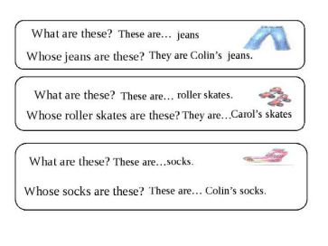 What are these? Whose jeans are these? What are these? Whose roller skates are these? What are these? Whose socks are these? These are… jeans They are Colin’s jeans. These are… roller skates. They are… Carol’s skates These are… socks. These are… Colin’s socks.